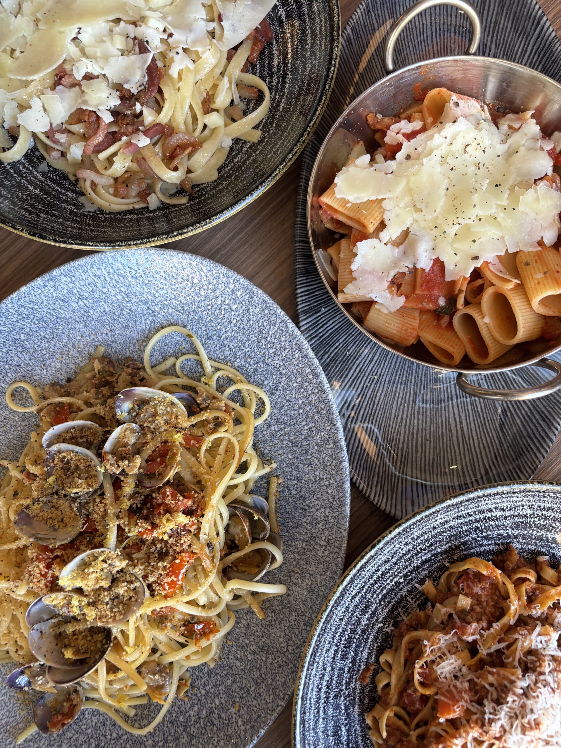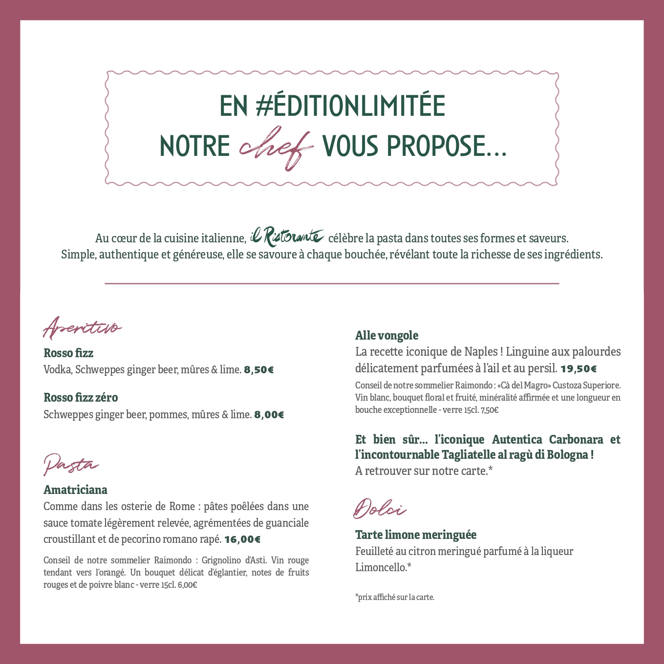Commencez avec un Rosso Fizz, puis laissez-vous tenter par nos pâtes Amatriciana, Alle Vongole, Autentica Carbonara ou les fameuses Tagliatelle al ragù. Et pour conclure en douceur, savourez notre tarte limone meringuée.